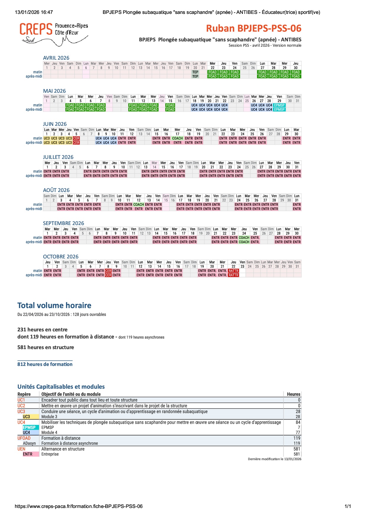 prochaine session : du 22 avril au 23 octobre 2026